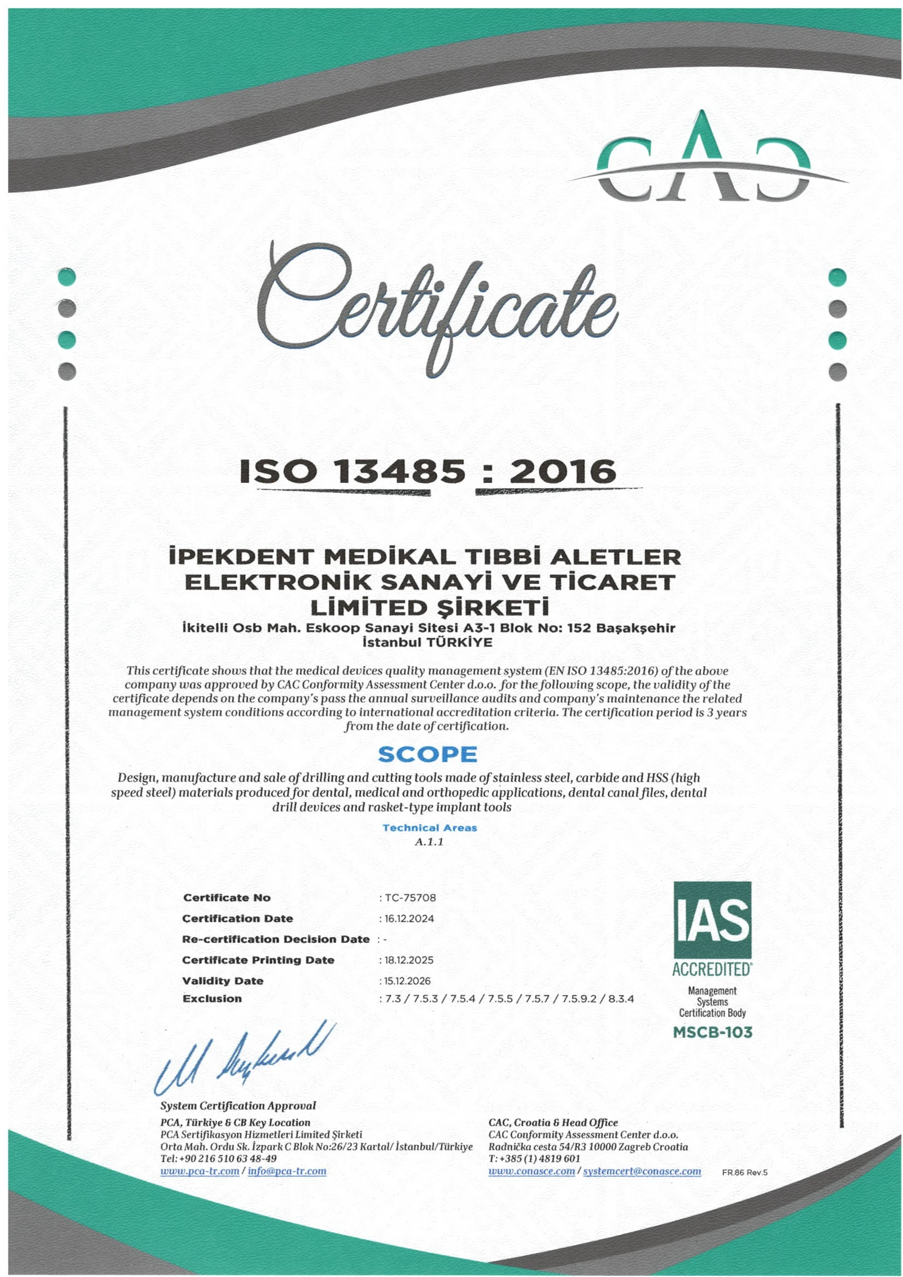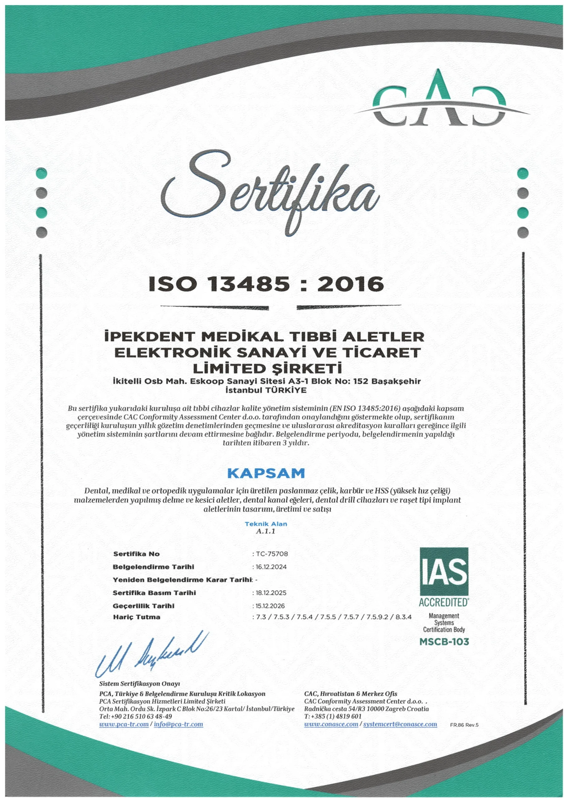 İpek Dental olarak, dental ve cerrahi ekipman üretiminde uluslararası kalite ve güvenlik standartlarına büyük önem veriyoruz. Ürünlerimizin tasarımından üretim sürecine kadar tüm aşamalar, ilgili sektör standartlarına uygun olarak titizlikle yürütülmektedir.